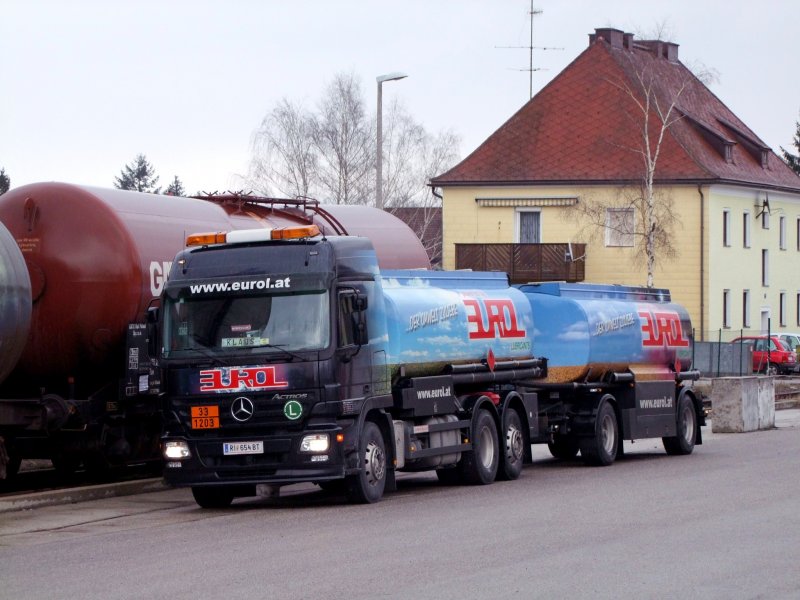 ACTROS(460PS) entleert am Bhf. Ried i.I. Schwerölbeladene Waggons; 090326