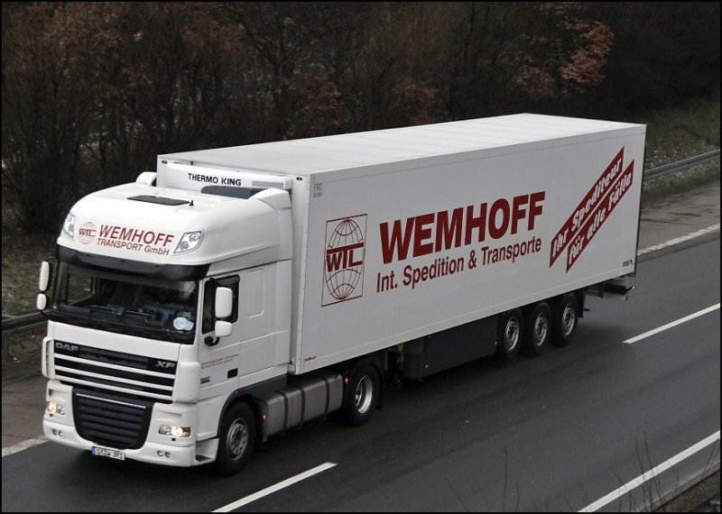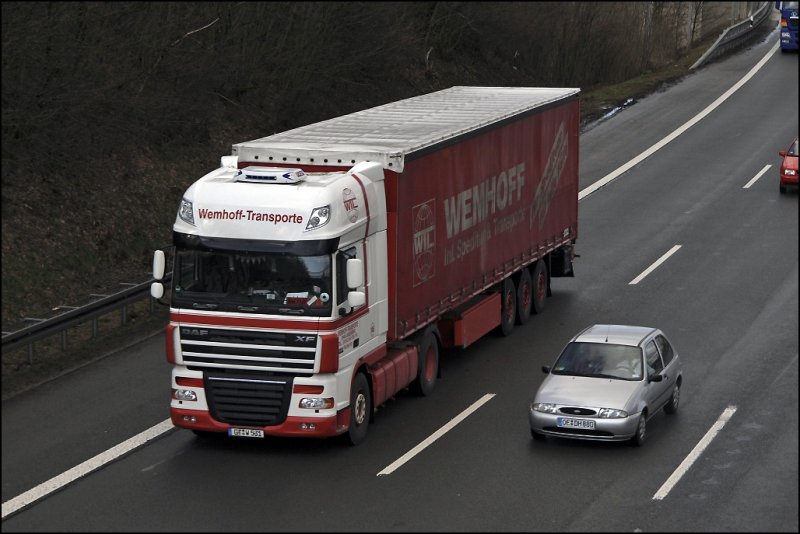 WEMHOFF transportiert auch Güter im Planenauflieger. Ein DAF XF105.460SSC "SuperSpaceCab" ist in Richtung Süden unterwegs.