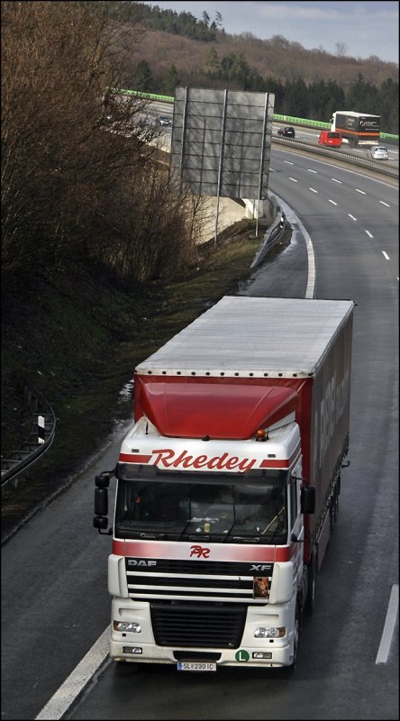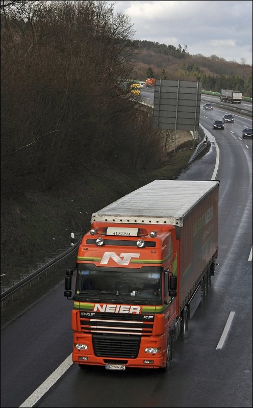 DAF XF95.480 der NEIER Transport&Logistik GmbH aus Nüziders/Voralberg ist durch das Sauerland unterwegs. (23.03.2009)