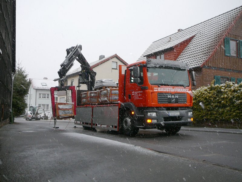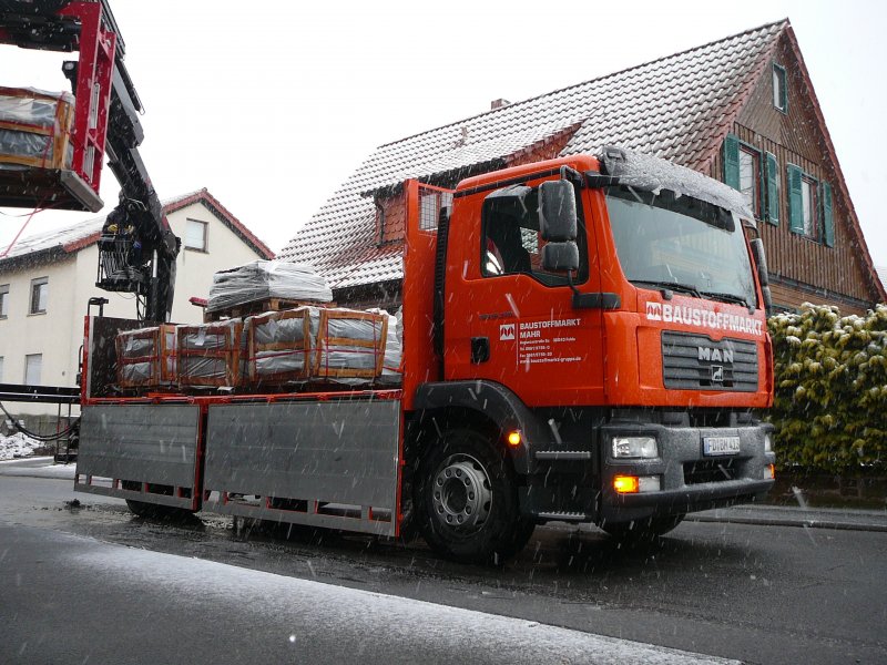 MAN 18.330 wird bei Schneetreiben entladen, 36100 Petersberg -Marbach am 25.03.09
