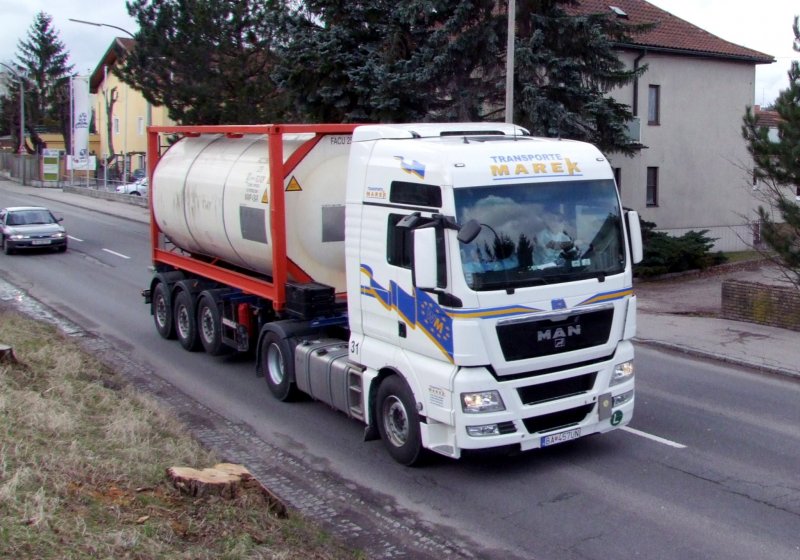 MAN-Sattel transportiert einen ContainerTank auf der B143 Richtung Vöcklabruck; 090327