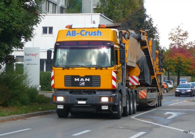 MAN von AB - Crush mit Strassenbaumaschiene Unterwegs in Nidau am 12.10.2009