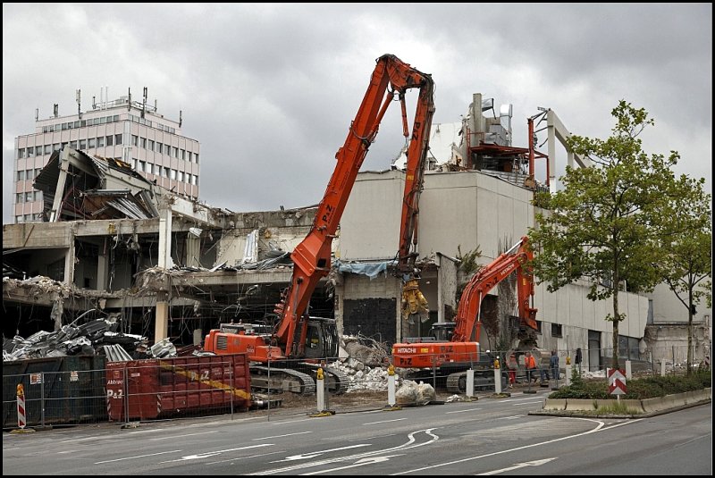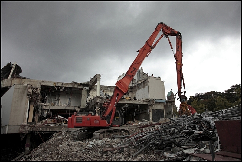 Der HITACHI ZAXIS 500 mit seiner Abbruchzange bei der Arbeit. Wegen der Gefahr von herumfliegenen Abbruchmaterial wurde die Straße immerwieder kurzfristig gesperrt.