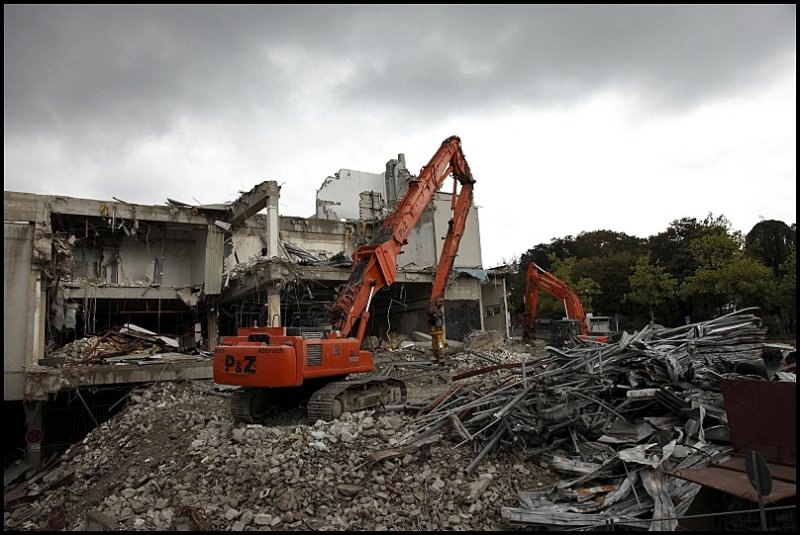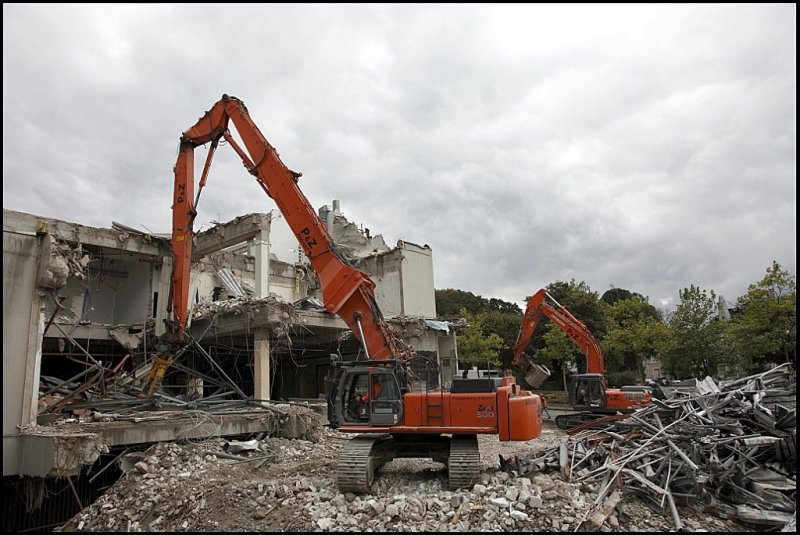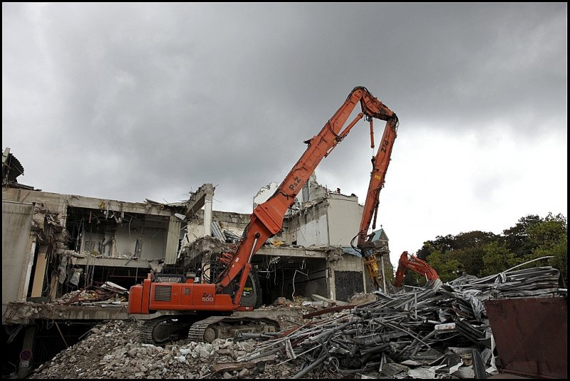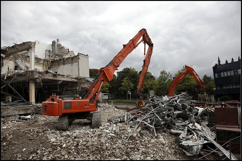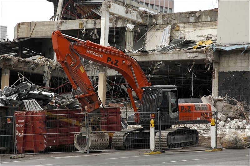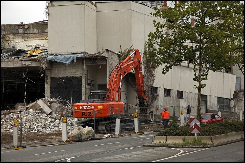 Bild ID Nr.25000 auf Fahrzeugbilder. Sofort nach der Arbeit mussten die weiteren Abbrucharbeiten abgelichtet werden. Der HITACHI ZAXIS 500 mit seiner Abbruchzange wird gleich seine Abbruchtätigkeitena aufnehmen. (15.09.2009)