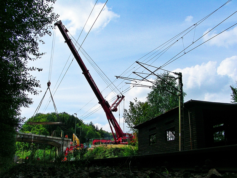 der Autokran wartet auf das Kommando die alte Brücke bei Pasberg entfernen zu dürfen