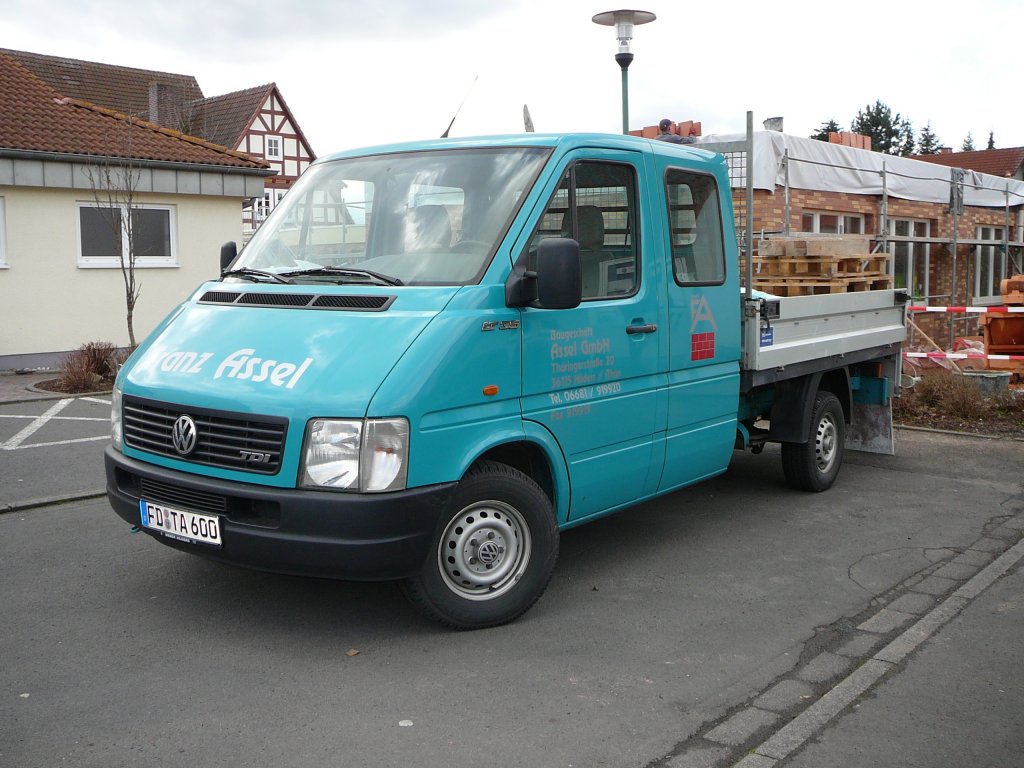 VW LT TDI als Doppelkabiner mit kurzer Ladefläche, der Baufirma FRANZ ASSEL, steht vor einer Baustelle im 36100 Petersberg-Marbach im März 2010