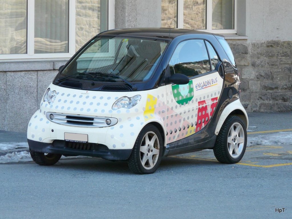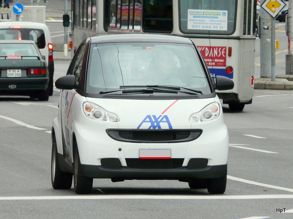 Weisser Smart mit Werbung unterwegs in der Stadt Lausanne am 27.03.2010