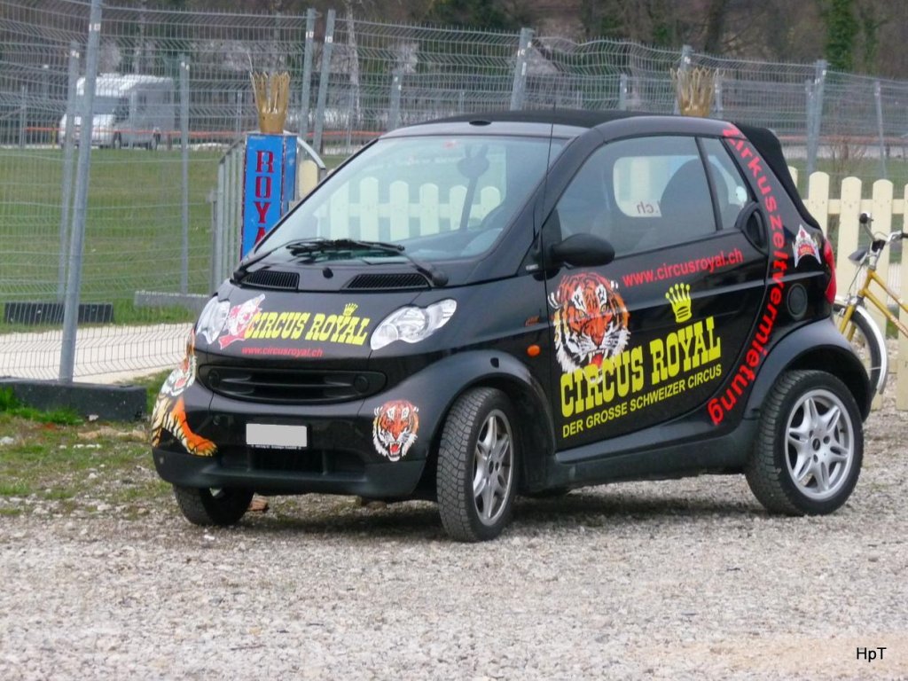 Grauer Smart mit Werbung unterwegs in der Stadt Lausanne am 27.03.2010