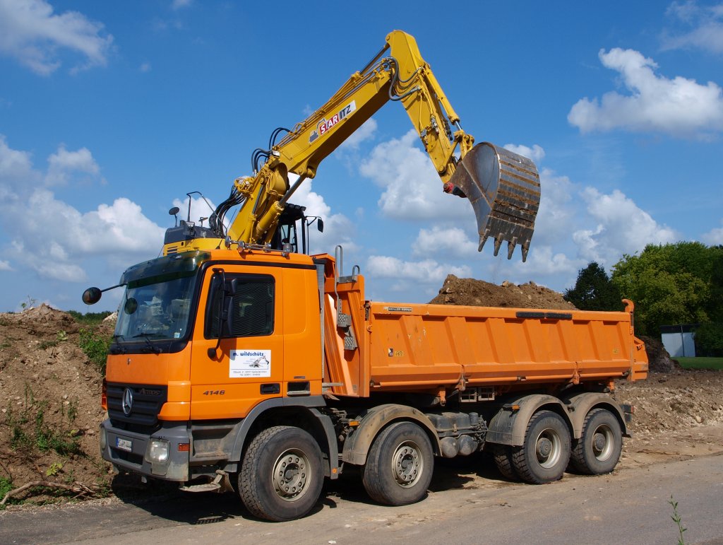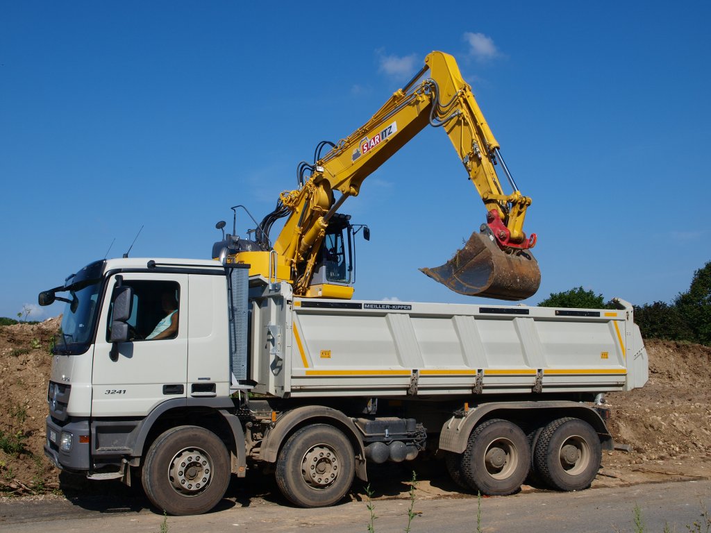 Hier wird ein blitzneuer Actros 3241 am 06.08.2010 auf der Campusbaustelle der RWTH in Aachen von einem Komatsu PC 228US Lc beladen. Die neuen Actros Lkw kann man gut an den Aussenspiegeln erkennen, die Kunstoffabdeckung ist mit Riffelblechoptik ausgestattet.