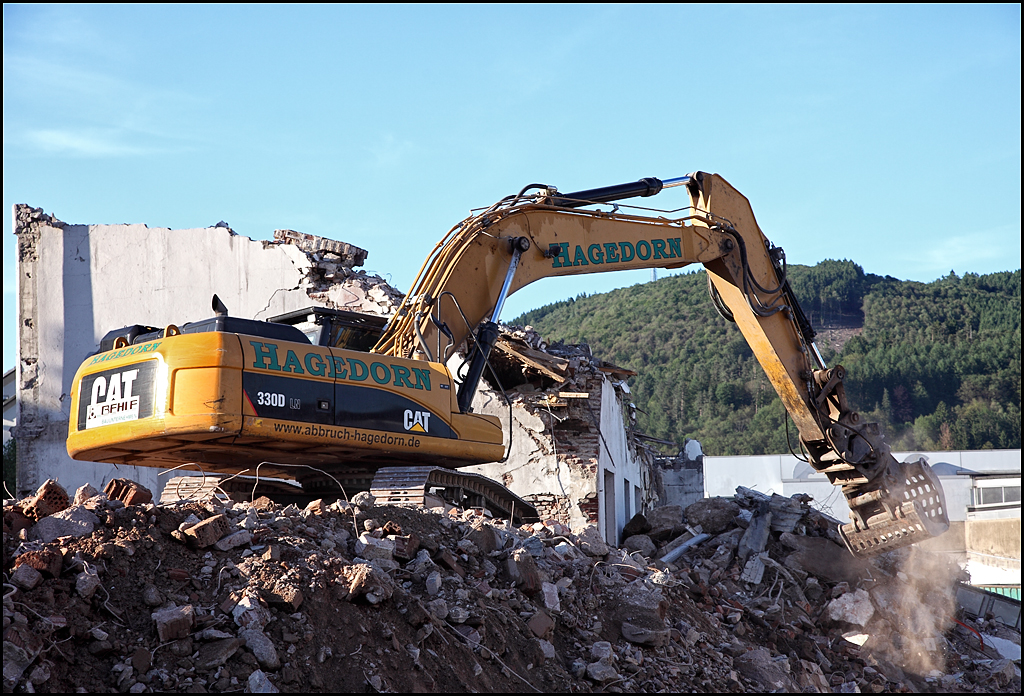 Im Juni wurde in Plettenberg eine Firma abgerissen. Auftragnehmer ist ABBRUCH HAGEDORN. Im Bild ein CAT 330D LN der damit beschäftigt ist, Eisen aus dem Abbruchmaterial herauszusuchen...