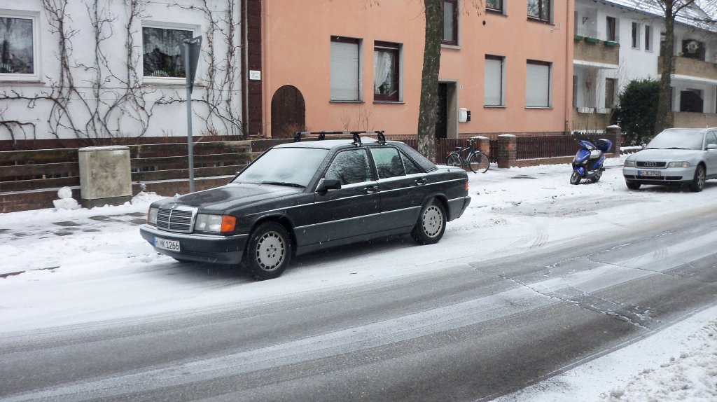 Mercedes 190 E, bei schneefall in Lehrte, am 08.12.10.