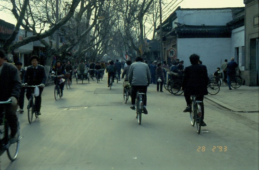 Am 28.02.1993 ist das Strassenbild in der chinesischen Stadt Suzhou noch von Fahrrädern geprägt, nur ganz vereinzelt sind Autos unterwegs