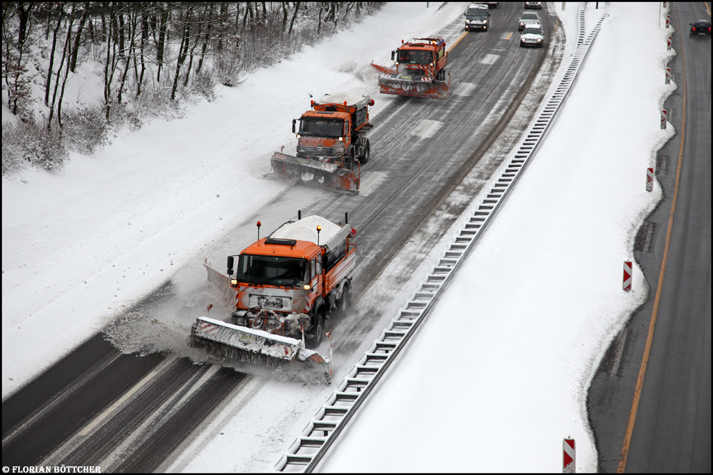 Auch im Norden von Luxemburg liegt Schnee, sodass die Räumdienste ständig im Einsatz sind. Hier ein Lkw der Marke Scania mit einem Schneepflug und Salzstreuanlage auf dem Kipper. Aufgenommen beim Schumannseck am 18.12.2010.