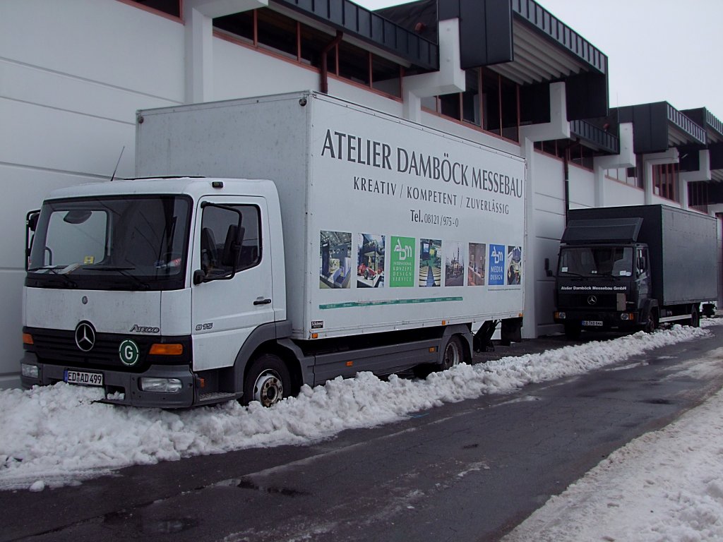 ATEGO-815 sowie MB814 eines Messebauunternehmens stehen hinter den Messehallen in Ried i.I. ;100205