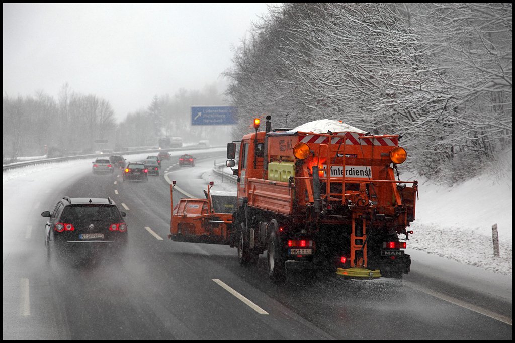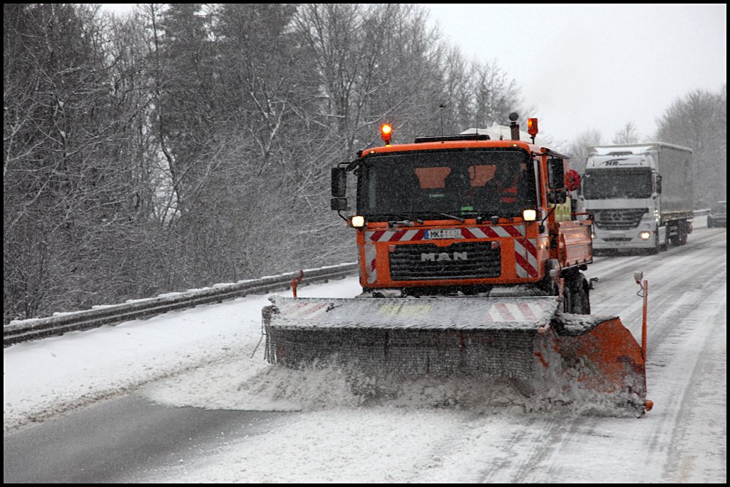 Der Winter hat das Sauerland am 29.01.2010 ordentlich verschneit. Während die Überhollspur geräumt wird überhollt der MAN 19.364 uns aus der Normalspur bei Lüdenscheid-Süd.