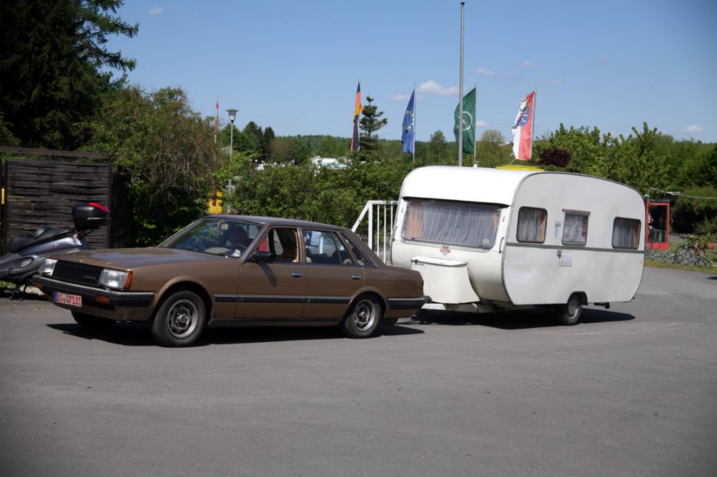 Unser Camping-Oldie Gespann, bestehend aus einer Tabbert Comtesse 425 von 1970 und einem 1981er Datsun Laurel Diesel als Zugfahrzeug, fotografiert im Mai 2008