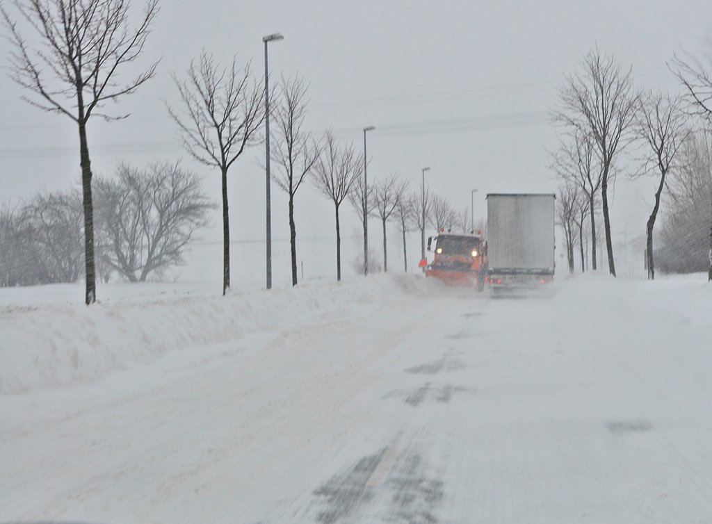 Winterdienst auf norddeutschen Strassen, oft ist es langsam zu eng für 2 LKW, das was hier unscharf erscheinen mag ist gutes Schneetreiben auf den Strassen rund um Stralsund am 02.02.2010