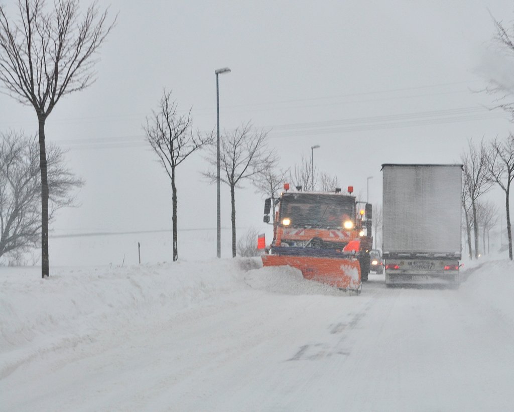Winterdienst auf den Strassen rund um Stralsund, oft ist es langsam zu eng für 2 LKW, das was hier unscharf erscheinen mag ist gutes Schneetreiben am 02.02.2010