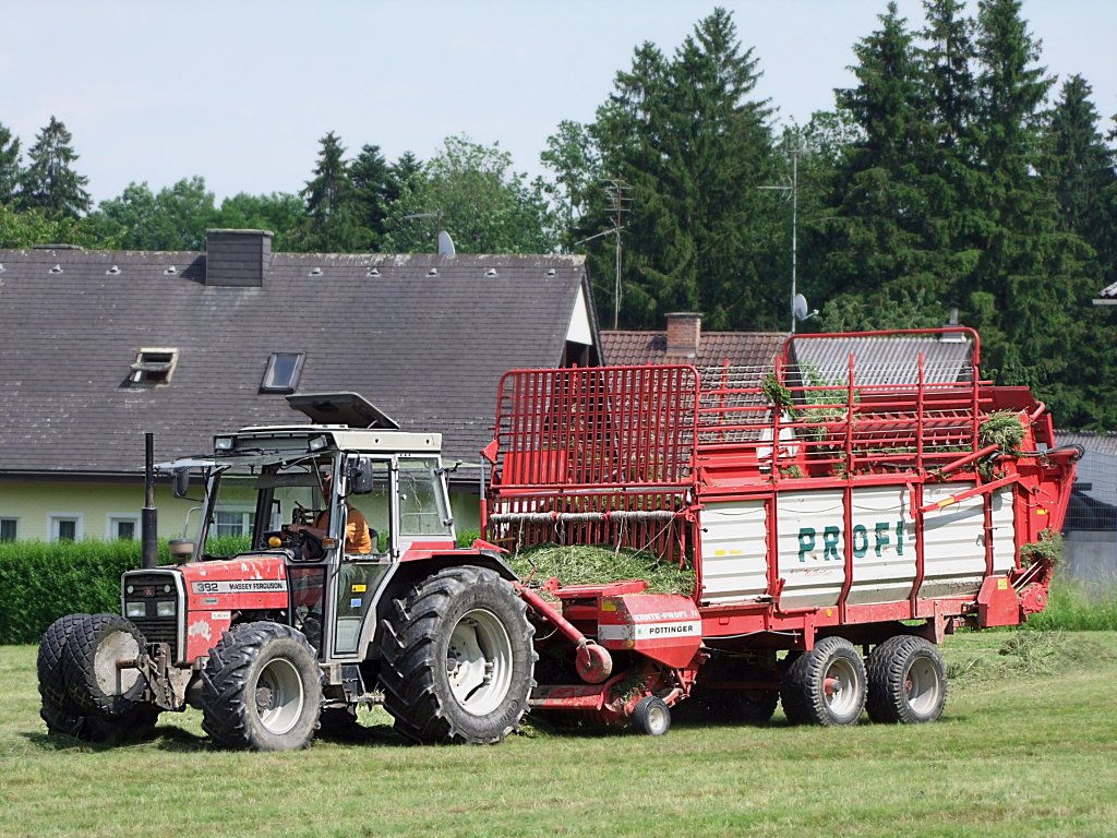 MF392 holt mit dem Pöttinger-PROFI-Ladewagen das geschnittene Gras von der Wiese;100625