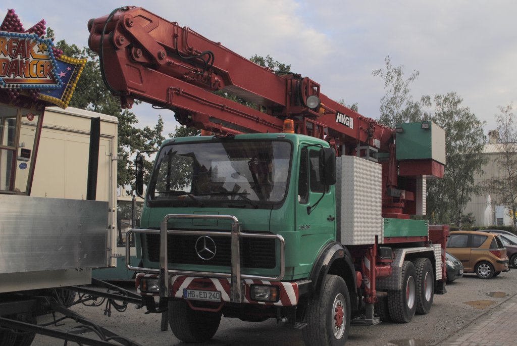 Mercedes LKW, mit Kran, am 27.07.2010 Lehrte/Schützenplatz