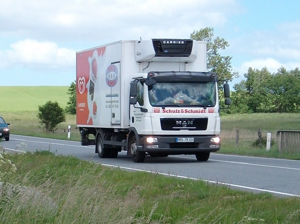 Genau zur richtigen Zeit ist dieser MAN-Kühllaster auf der B96 unterwegs.