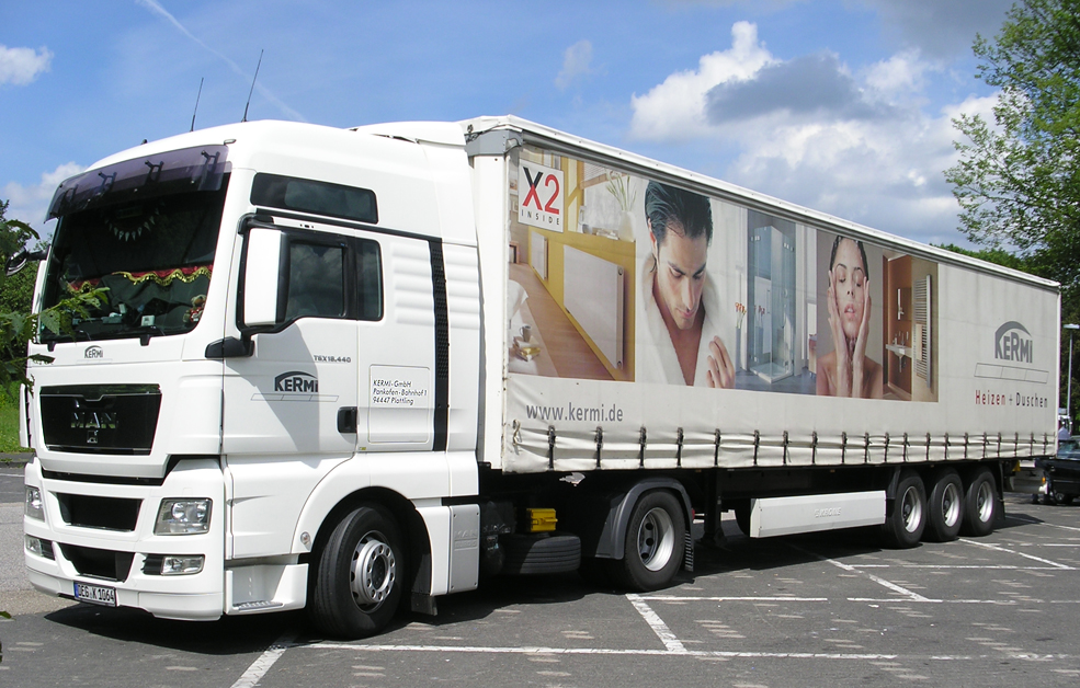 ...MAN - Sattelzug der KERMI-GmbH mit aufwendiger Werbung am Planenauflieger - Typ TGX 18.440