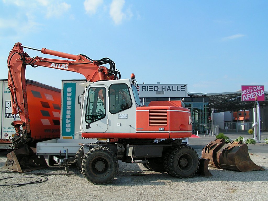 ATLAS Radbagger steht mit seinem Zubehör vor den Toren der Rieder-Messehallen zur Versteigerung bereit;100624