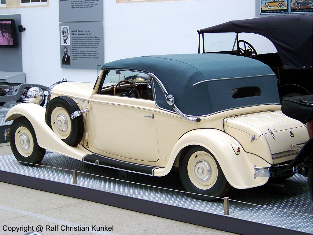 Röhr 8 Typ F Cabriolet mit der Karosserie von Gläser/Dresden - Baujahr 1933, Hersteller: Neue Röhr AG, Ober-Ramstadt in Hessen, Deutschland - Zirka 3.500 Röhr-Automobile wurden zwischen 1927 und 1935 gebaut, ca. 250 Stück davon vom Typ F - Das abgebildete Fahrzeug hat folgende technische Daten: flüssigkeitsgekühlter 8-Zylinder-Viertakt-Ottomotor (Konstruktion des Typ F Motors von Ferdinand Porsche), Hubraum: 3.287 cm ³, Leistung: 55 kW (75 PS) bei 3.200 U/min, Einscheibentrockenkupplung, ZF-Aphon-Getriebe mit Schnellgang und Freilauf, 2. bis 4. Gang synchronisiert, L x B x H: 4.800 x 2.000 x 1.660 mm, Leergewicht: 1.580 kg, Vmax: 125 km/h - fotografiert am 08.05.2008 im Verkehrsmuseum Dresden - Copyright @ Ralf Christian Kunkel