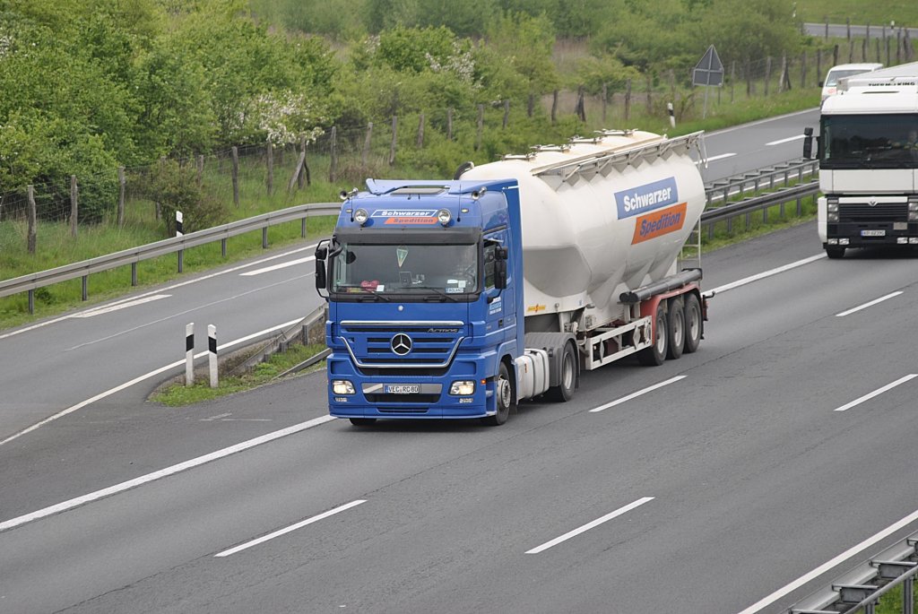 Mercedes Actros Silosattelzug, auf der A2 bei Lehrte/Niedersachen, am 11.05.2010.