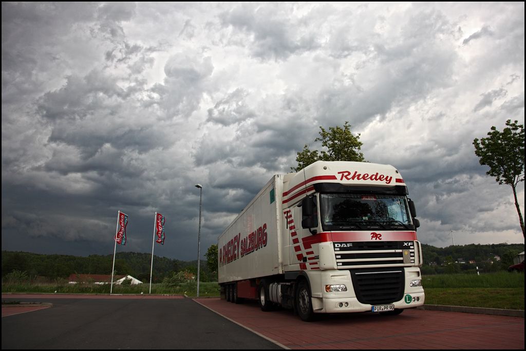 DAF XF105.460SCC "SuperSpaceCab" von P.RHEDY SALZBURG aus der deutschen Niederlassung Altenburg/Sachesen verbringt das Wochenende auf einem Parkplatz in Neuenmarkt-Wirsberg. (24.05.2010)
