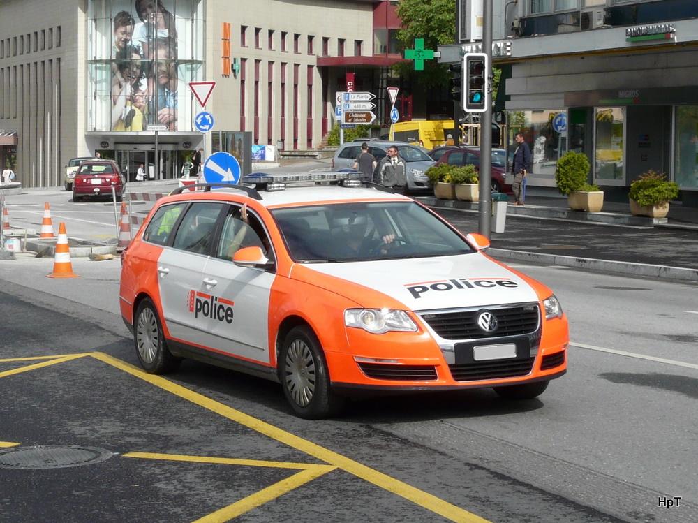 VW Polizeiauto der Walliser Polizei unterwegs in der Stadt Sion am 10.05.2010