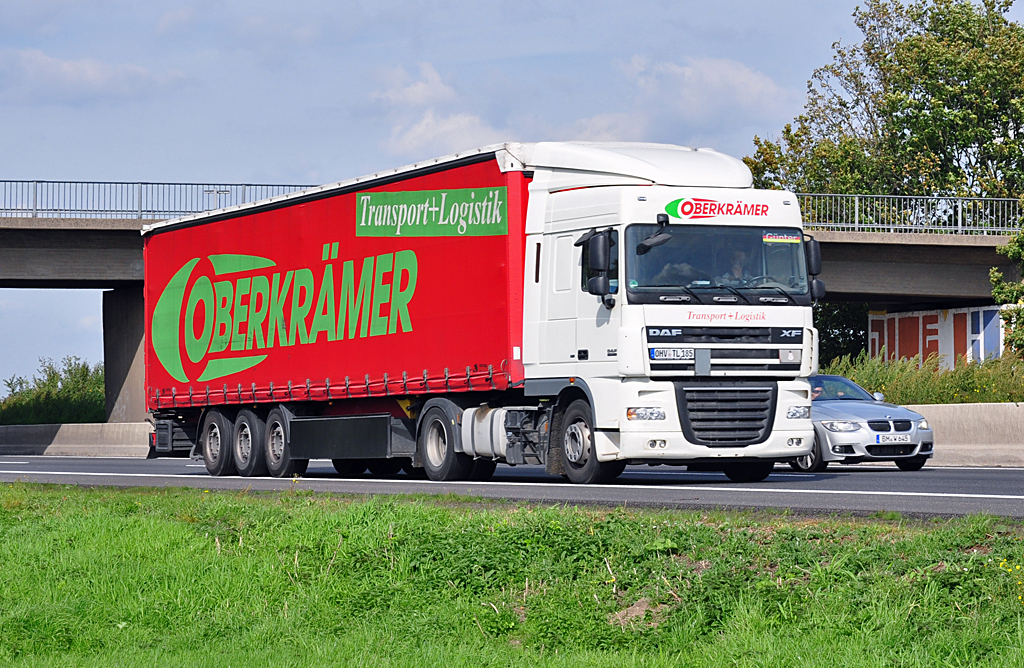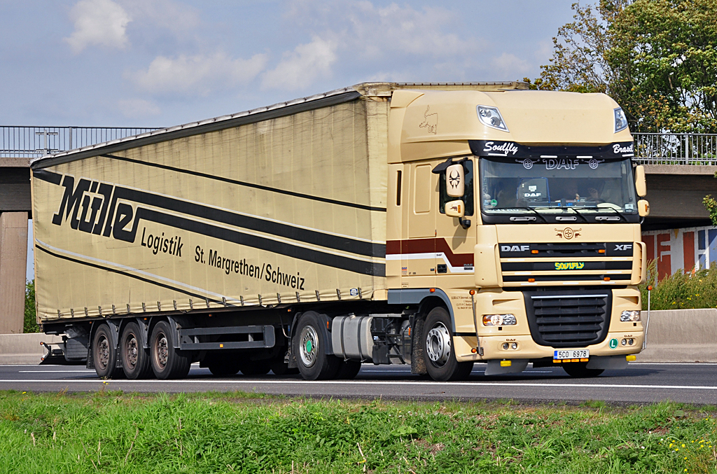 DAF XF mit Planenauflieger am 07.10.2010 auf der A4 kurz vor dem Autobahnkreuz Aachen Fahrtrichtung Köln.