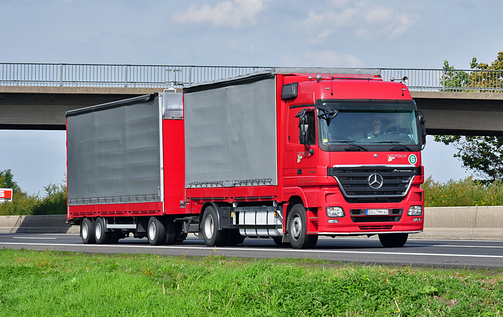 Actros mit Planenauflieger am 07.10.2010 auf der A4 im Autobahnkreuz Aachen Fahrtrichtung Köln.
