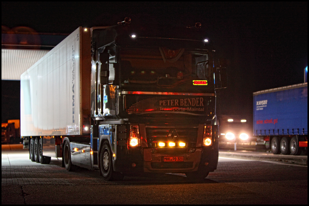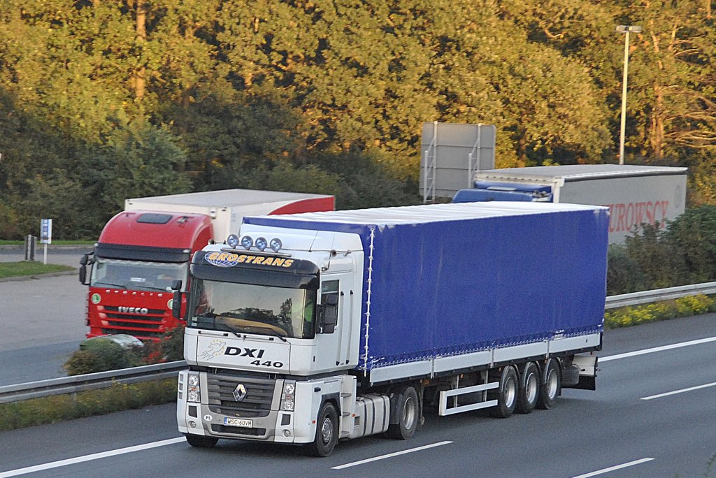 Polnischer Renault Magnum mit Planenauflieger am 07.10.2010 auf der A4 kurz vor dem Autobahnkreuz Aachen Fahrtrichtung Köln.