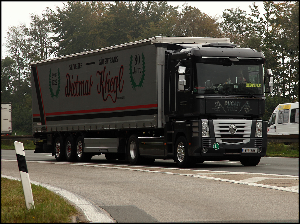Und wieder ist er da ;-) RENAULT MAGNUM 500DXI von PETER BENDER Transporte. Aufgenommen am Morgen des 13.10.2010 auf dem Rasthof Sauerland-Ost. Dicke Nebelsuppe....