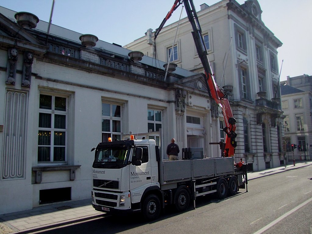 VOLVO-400 von Monument hievt mit dem aufgebautem Hydraulikkran Bauteile auf ein Dach in Brüssel;100831