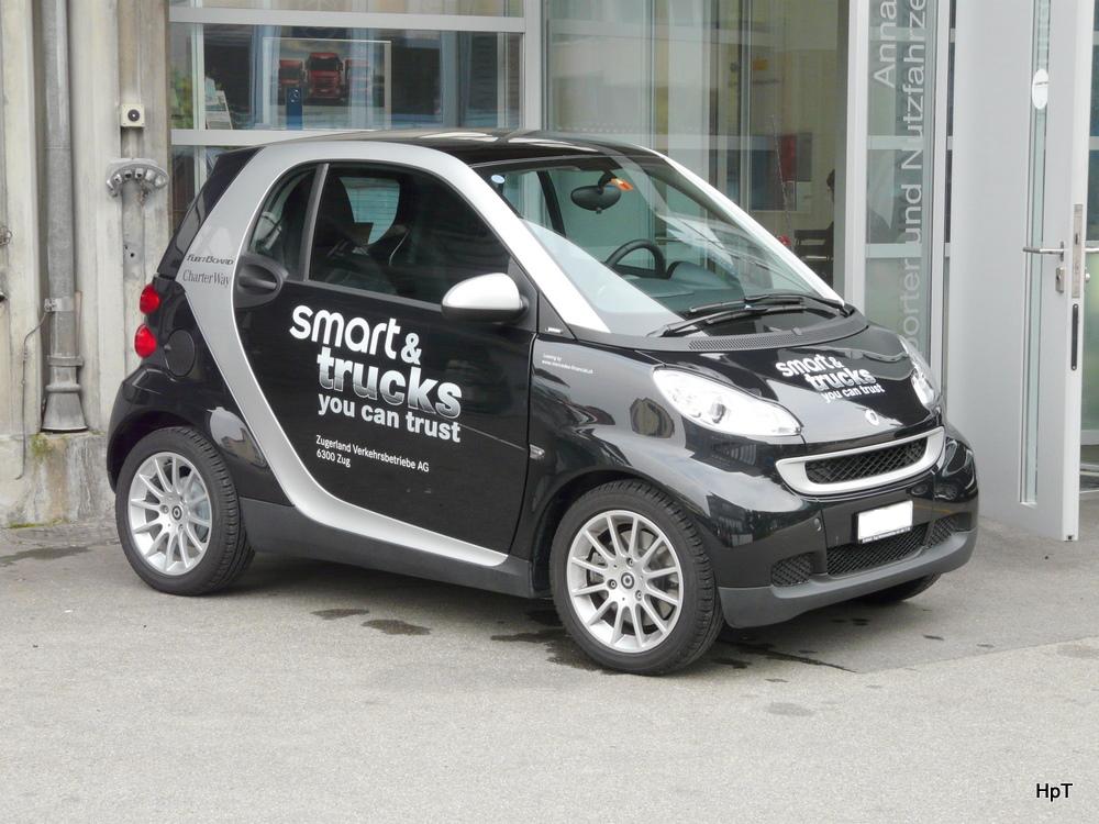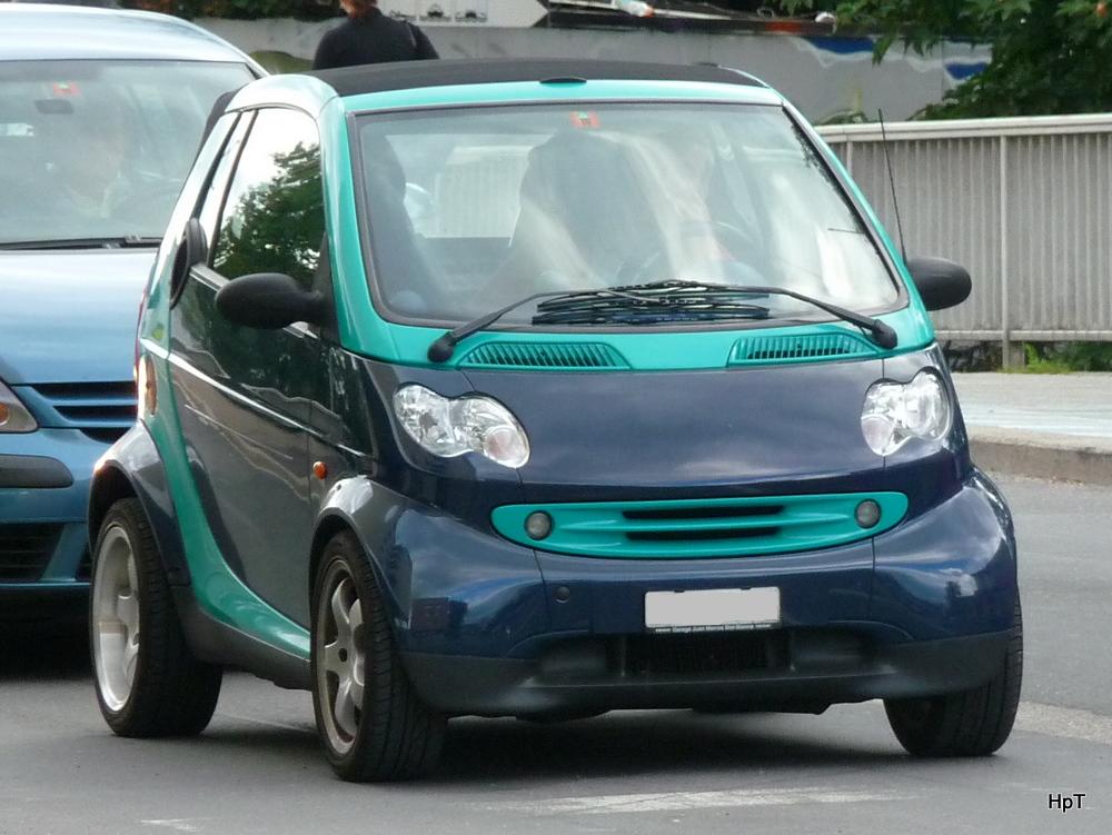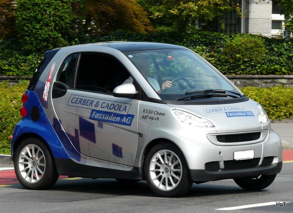 Blau-Grauer Smart mit Werbung unterwegs in der Stadt Zug am 20.08.2010