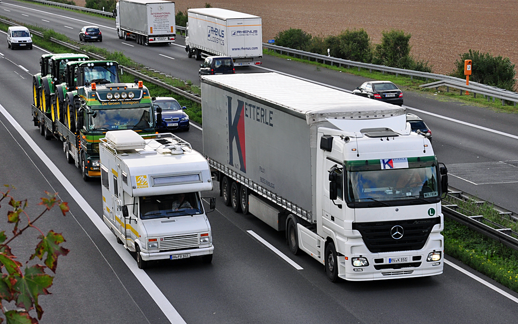 Gedränge auf der Autobahn A61. MB Actros V8 überholt Wohnmobil, der Sattelzug aus den NL mit Traktoren wird auch schon ungeduldig !!