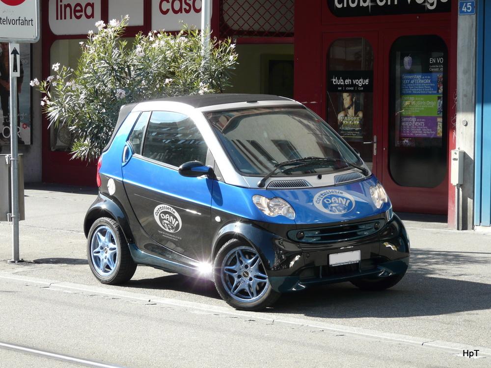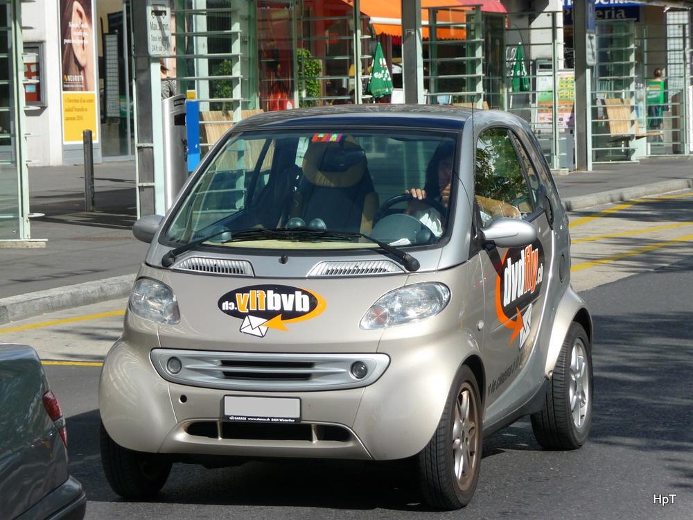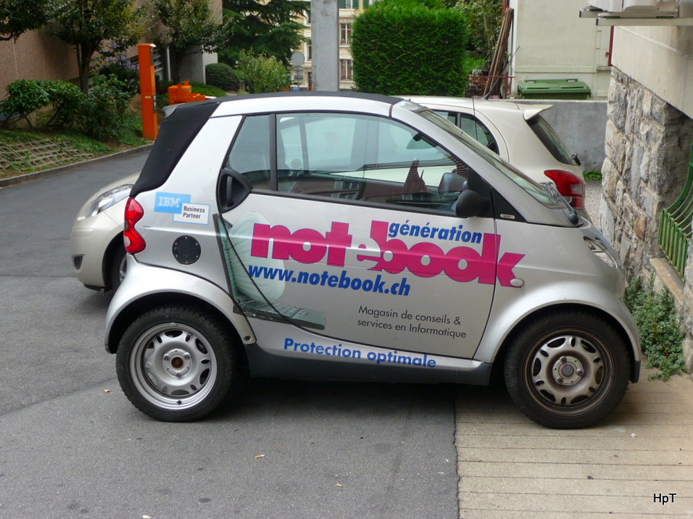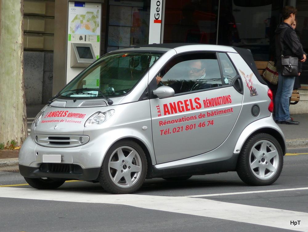 Grauer Smart mit Werbung unterwegs in der Stadt Lausanne am 09.09.2010