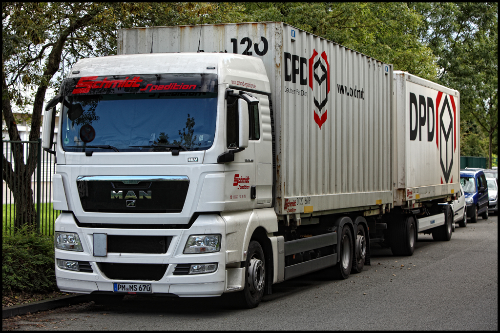 MAN TGX 26.400XLX der SCHMIDT SPEDION aus Verder/Havel steht mit DPD Wechselbrücken vor dem Cordes&Simon/DPD Lager in Hagen. Seit 1991 ist das Unternehmen für DPD in Deutschland unterwegs. Aufgabengebiet ist die Presselogistik, Parketdienste und Stückguttransporte bis 2 Tonnen.