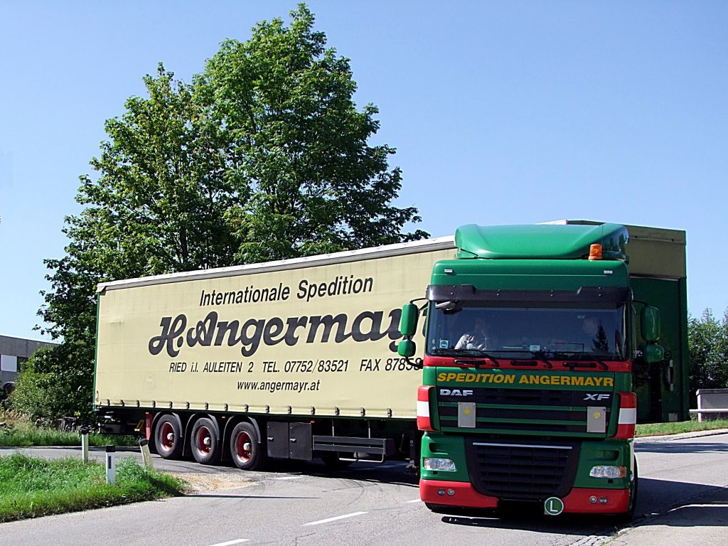 DAF XF105.460 der Sped.Angermayr veranschaulicht, daß ein Sattelzug etwas mehr Platz zum Einbiegen als ein PKW braucht;110909