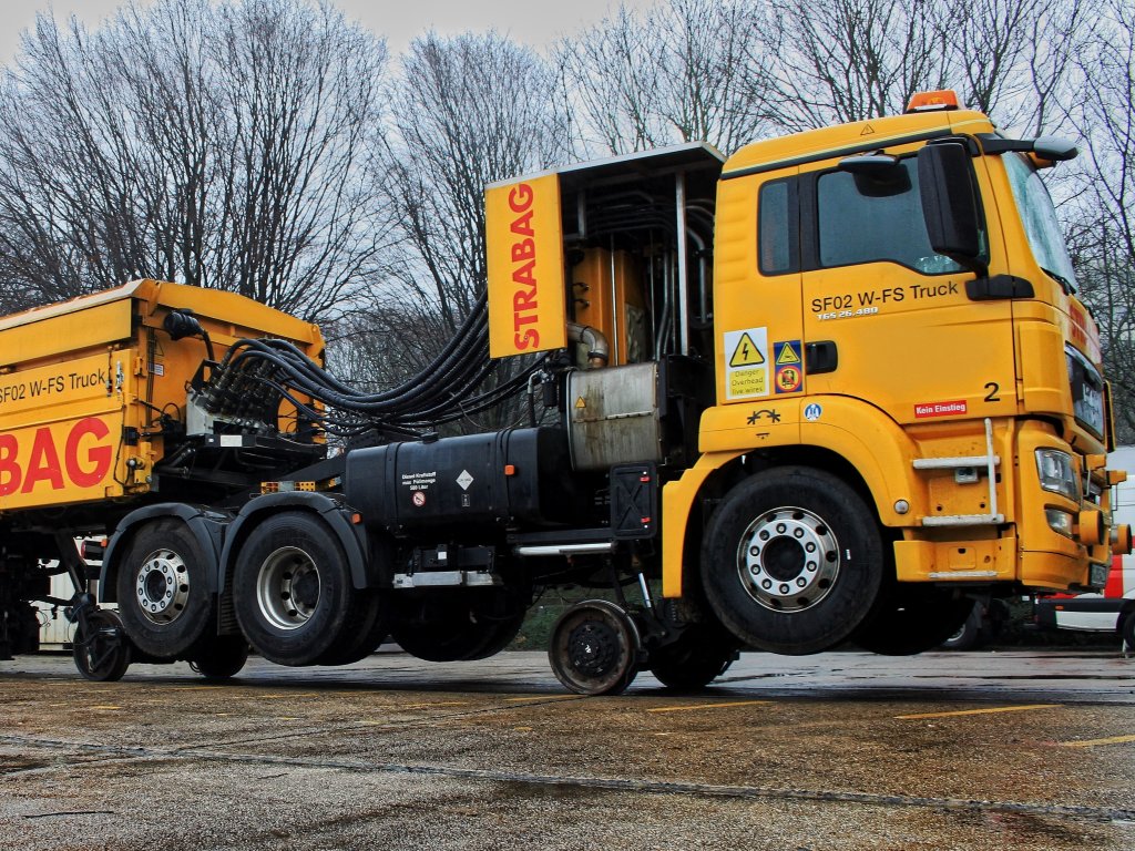 Drei Achsen für die Strasse, zwei für die Schiene. MAN TGS 26.480 Zweiwegefahrzeug mit Schienenfräß-Truck SF02 W-FS Truck von STRABAG am 22.12.2011 in Aachen West.