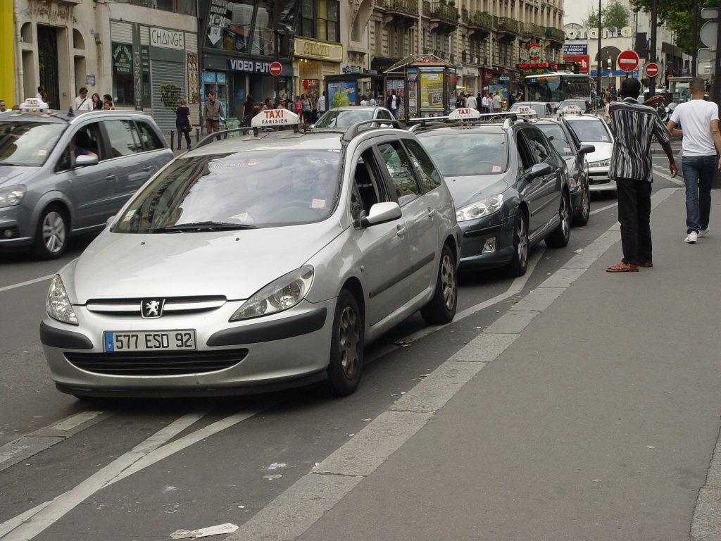 An der ehemaligen Endstation des Skytrain "Taksin Bridge" in Bangkok wartet eine ganze Reihe von roten Sammeltaxi auf den Einsatz. (07.07.2009)