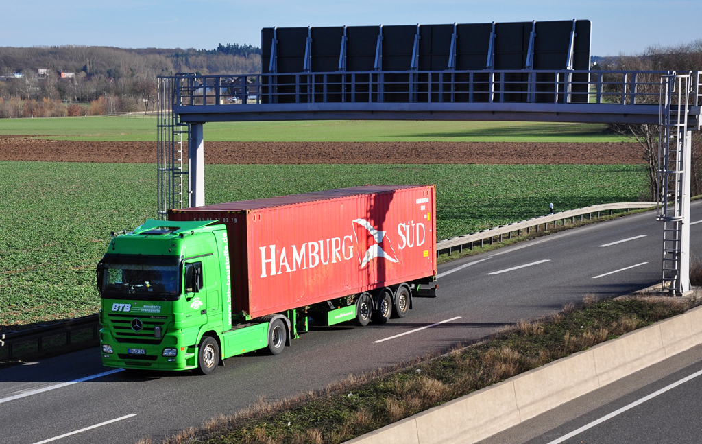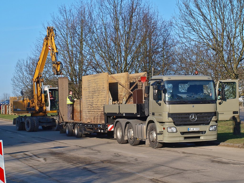 Hier wird am 08.02.2011 mit einem Bagger der Tieflader eines Actros 2555 am Seffenter Weg in Aachen abgeladen.