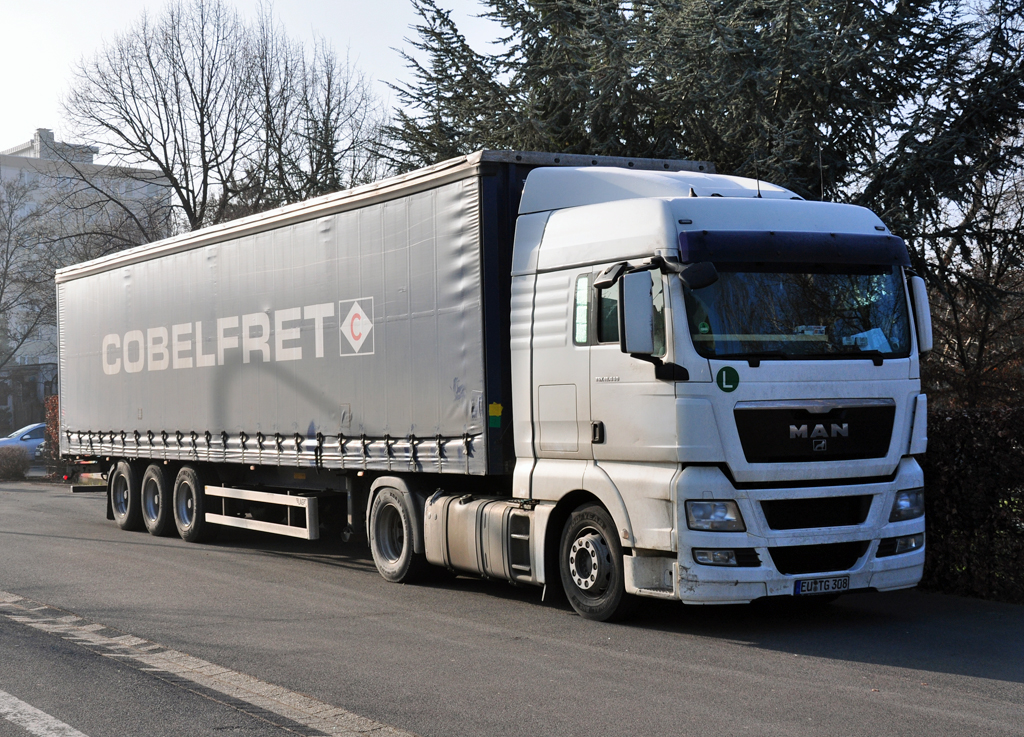 MAN TGS 18.480 der Aachener Firma Schlenter mit Kippersattelauflieger am 08.02.2011 auf der Campusbaustelle der Rwth in Aachen.