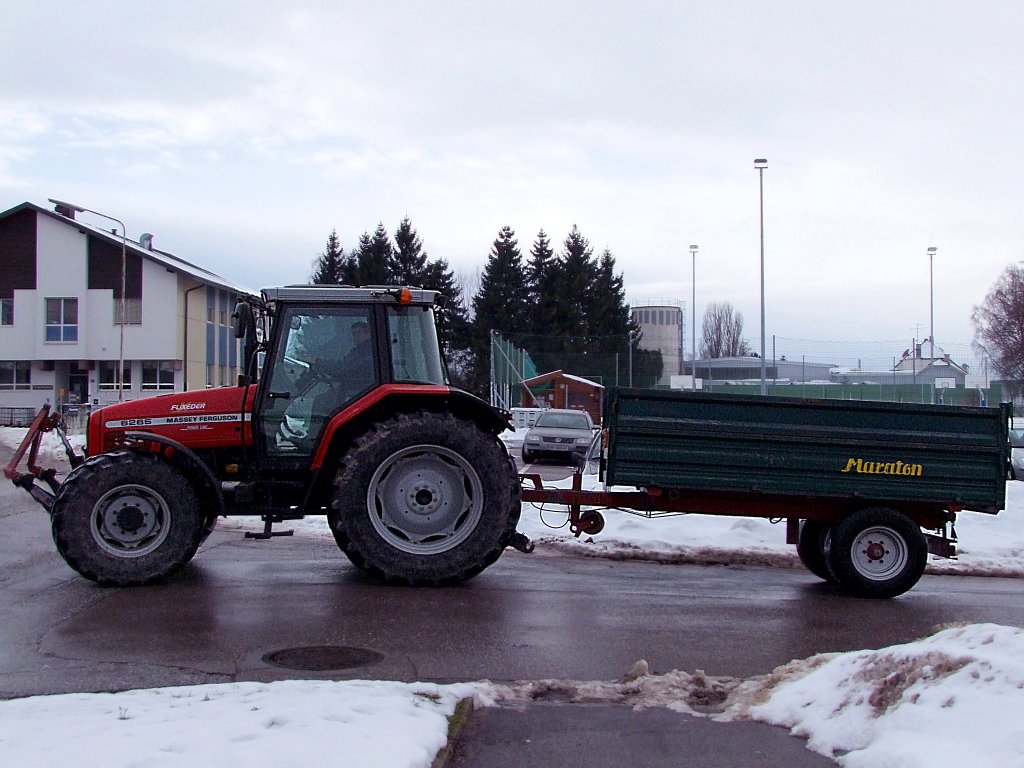 Ein Massey-Ferguson 7495 (200PS) mit Mammut Tandem-Muldenkipper vom Landw. Lohnunternehmen Gebr. Kamp aus Geilenkirchen am 08.02.2011 auf der Campusbaustelle der Rwth in Aachen. Damit der Traktor seine Kraft auch auf die Vorderräder bringt, hat er ein 800kg Gewicht an der Fronthydraulik hängen.