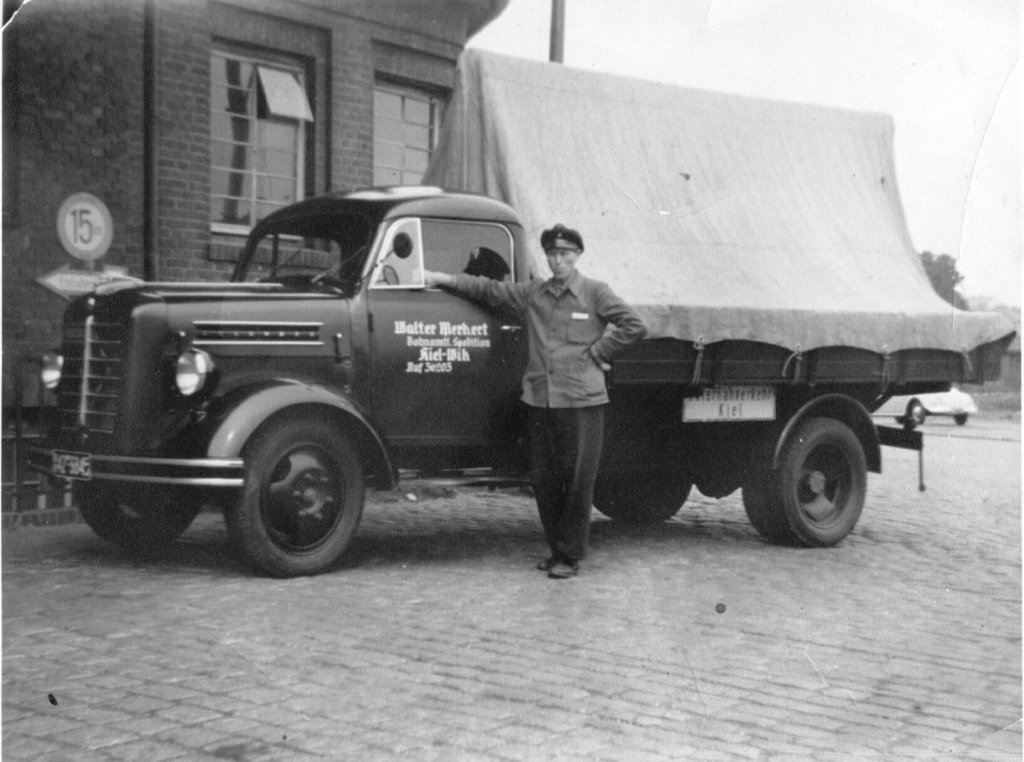 Walter Merkert (auf der Ladefläche) mit seinem Mercedes L 2000, Baujahr 1933 mit 55 PS Benzinmotor im August 1939 beim Laden von Schränken bei der Standortverwaltung in Dänisch-Nienhof (Schwedeneck). Der zweite Lke, ein Opel-Blitz ist nur links am Bildrand zu sehen.