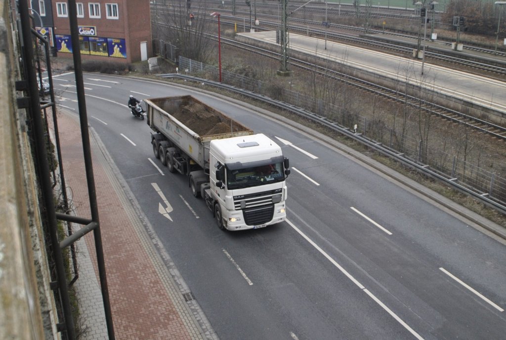 Kollegen vorlassen ;-) Der neue DAF XF105.460SC "SpaceCab" verlässt einen Kunden bei Werdohl in Richtung Lüdenscheid. (18.02.2011)