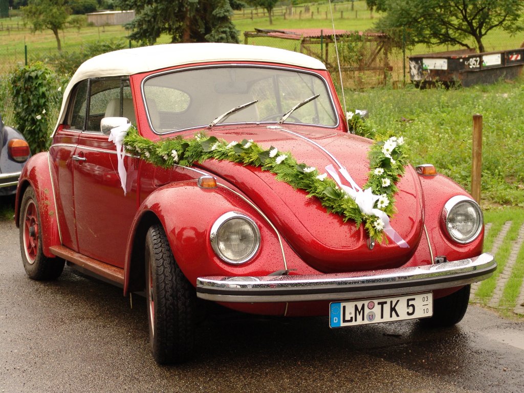 Dieser wunderschöne Volkswagen Käfer Cabrio stand am 28.08.2004 als Hochzeitsauto geschmückt vor der Kirche