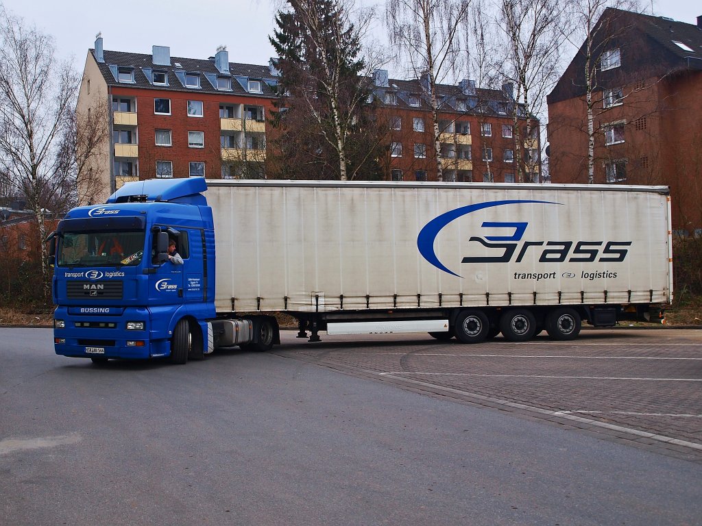MAN TGA 18.440 mit 3achs Planenauflieger. Es ist nicht ganz einfach so einen Sattelzug rückwärts einzuparken, aber null Problem für den Profi von der Spedition Brass. Gesehen am 18.02.2011 auf dem Parkplatz vor dem Continentalwerk in Aachen.